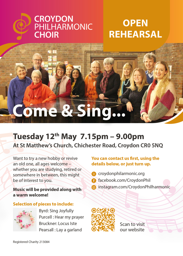 The Croydon Philharmonic Choir is the largest and longest-established choir in Croydon. We have been singing for more than 100 years and perform four concerts each year. We have around 70 members who comprise four choral sections: soprano, alto, tenor and bass. We have an extensive repertoire, ranging from classic choral pieces to contemporary music. (Find more about our history here.)