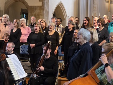 13 April 2024: The choir scored a resounding triumph with its April in Fairfield concert yesterday, sharing the applause with its choral partner, the Basingstoke Choral Society. (Photo shows the view from the choir as the Docklands Sinfonia warms up.) The joint choir numbered some 150 singers whose beautiful rendering of the wonderful Requiem Mass by Camille Saint-Saens won acclaim from the audience. The same was true for the Saint-Saens Organ Symphony, played by Docklands Sinfonia with CPC accompanist Ian le Grice taking the lead role on organ. The concert ended with the combined choir singing the beguiling Cantique de Jean Racine by Gustave Faure. Conductor and music director David Gibson was generous in inviting applause for the choir, the audience responding with gusto. Audience comments afterwards were universal in their praise for a brilliant spring evening concert. For details of our forthcoming concerts, please visit our Concerts Page